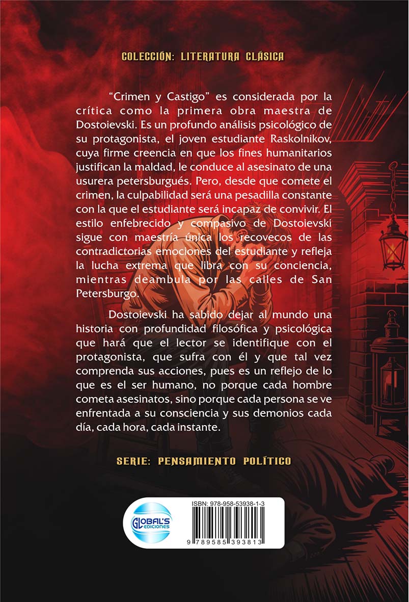 “Crimen y Castigo” es considerada por la crítica como la primera obra maestra de Dostoievski. Es un profundo análisis psicológico de su protagonista, el joven estudiante Raskolnikov, cuya firme creencia en que los fines humanitarios justifican la maldad, le conduce al asesinato de una usurera petersburgués. Pero, desde que comete el crimen, la culpabilidad será una pesadilla constante con la que el estudiante será incapaz de convivir. El estilo enfebrecido y compasivo de Dostoievski sigue con maestría única los recovecos de las contradictorias emociones del estudiante y refleja la lucha extrema que libra con su conciencia, mientras deambula por las calles de San Petersburgo.
