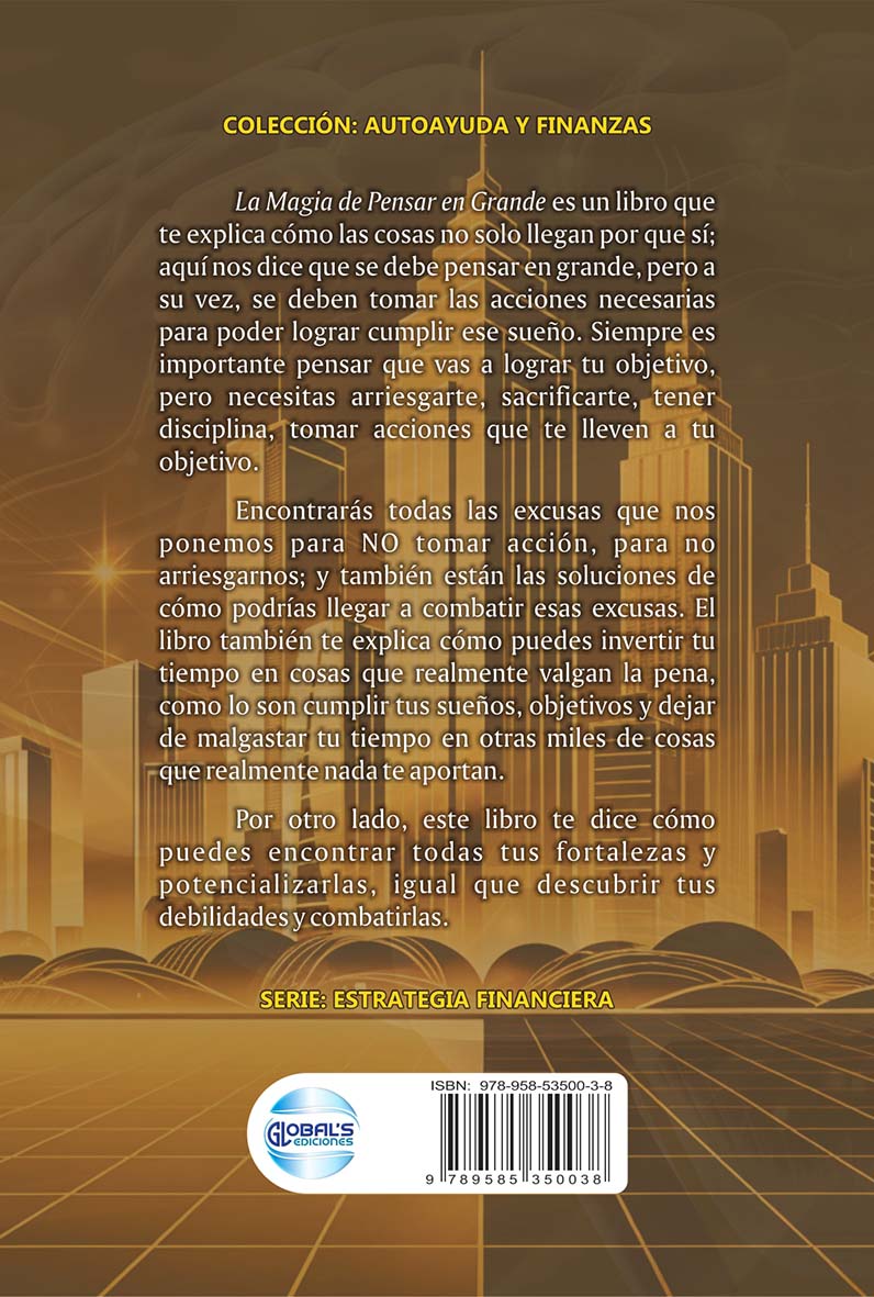 La Magia de Pensar en Grande es un libro que te explica cómo las cosas no solo llegan por que sí; aquí nos dice que se debe pensar en grande, pero a su vez, se deben tomar las acciones necesarias para poder lograr cumplir ese sueño. Siempre es importante pensar que vas a lograr tu objetivo, pero necesitas arriesgarte, sacrificarte, tener disciplina, tomar acciones que te lleven a tu objetivo.